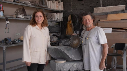La presidenta del Parlamento de Canarias, Astrid Pérez, ha visitado el taller del escultor Paco Curbelo en San Bartolomé (Lanzarote), donde ya ha comenzado a trabajar en la escultura que representará a La Graciosa en la entrada principal de la Cámara autonómica.