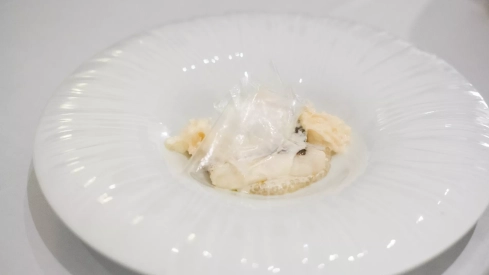 La alegoría se basa en un lomo de pescadilla cocida en su propia grasa, tapada por deliciosos ‘plásticos’ confeccionados con tapioca o fécula, entre otros elementos, y que representan distintas texturas de muchos de ese tipo de desperdicios plásticos que, lamentablemente, se prodigan en nuestro Gran Azul.