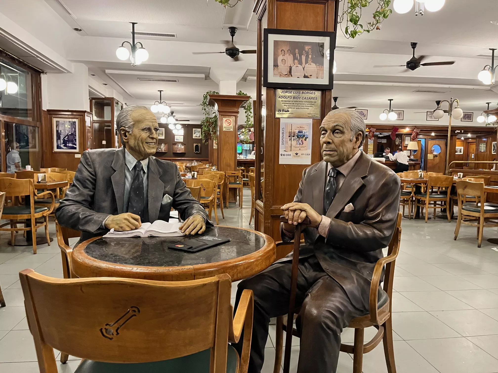 Me quedé en La Recoleta, casi al lado del cementerio, y me escapaba siempre que podía a La Biela, el café en el que Borges y Bioy se sentaron tantas tardes de tantos años a hablar de la vida y de la literatura, el local donde también se reunían los automovilistas campeones en los años cincuenta, con el pentacampeón de Formula I, el mítico Fangio, a la cabeza. Había una recreación de la figura de Fangio en la puerta de La Biela; pero luego dentro, según cruzabas la puerta, te encontrabas las recreaciones de Borges y de Bioy, que era el que vivía en La Recoleta, en la misma mesa en la que se sentaban siempre. Desde lejos, parecían reales, y uno casi vivía esa sensación que deja siempre La invención de Morel, esa obra maestra de Bioy Casares a la que se vuelve una y otra vez, como quien se adentra en su propio sueño sin tener que dormir para viajar lejos.