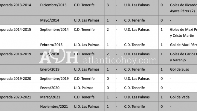 Hasta esta fecha, con cierre en la pasada temporada 2020/21, el C.D. Tenerife gana con 15 puntos por los 12 de la U.D. Las Palmas.