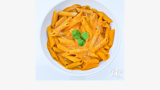 ¡Hola a tod@s y bienvenid@s a BC Organik!Me hace mucha ilusión compartir con ustedes la receta de hoy, ya que es una de mis preferidas.Pasta con salsa cremosa de calabaza, ¿suena bien, verdad? Y si la salsa está hecha con ingredientes saludables que sientan de maravilla, seguro que la disfrutas aún más.Aquí va la receta, espero que les guste.INGREDIENTES (4 personas):• 400 gr de pasta (yo he utilizado macarrones de espelta integrales)• 800 gr de calabaza• 100 ml de nata de coco (o la que más te guste)• 2 dientes de ajo• 4 cucharadas de salsa de tomate• 150 ml de caldo vegetal• 2 cucharadas de levadura nutricional (opcional)• Una cucharadita de pimentón dulce• Una pizca de comino• Aceite de oliva virgen extra• SalELABORACIÓN:1. Precalentar el horno a 180 grados.2. Cortar la calabaza en dados y ponerlos en una bandeja de horno con papel vegetal, aceite y sal.3. Introducir al horno, junto con los dientes de ajo con piel, durante unos 30 minutos.4. Mientras, cocemos la pasta durante el tiempo indicado por el fabricante.5. Cuando la pasta esté en su punto, la escurrimos y la reservamos en un caldero con una o dos cucharadas de aceite de oliva para que no se pegue.6. Una vez transcurrido el tiempo de horno, introducimos en una batidora la calabaza, el ajo sin piel y el resto de ingredientes para hacer la salsa.7. Trituramos todo bien.8. Cuando la salsa tenga la consistencia deseada, verter por encima de la pasta y lista para comer.¡Que la disfruten!