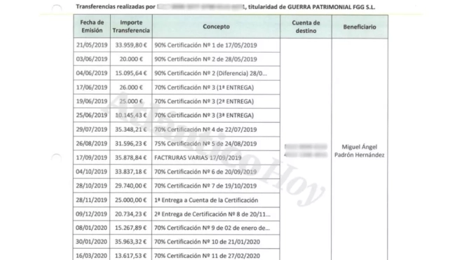 Las 16 transferencias ascienden a 376.549,60 euros y están fechadas entre mayo de 2019 y marzo de 2020. Las operaciones se habrían realizado desde la cuenta de la empresa Guerra Patrimonial FGG S.L. con destino a la cuenta de Miguel Ángel Padrón, exjefe de servicio de Parques y Jardines, según el informe de la Guardia Civil.