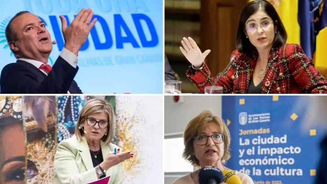 Arriba, de izquierda a derecha: Augusto Hidalgo y Carolina Darias; abajo, en el mismo sentido, las últimas presidentas de Sociedad de Promoción de Las Palmas: Inmaculada Medina y Encarna Galván. / AH