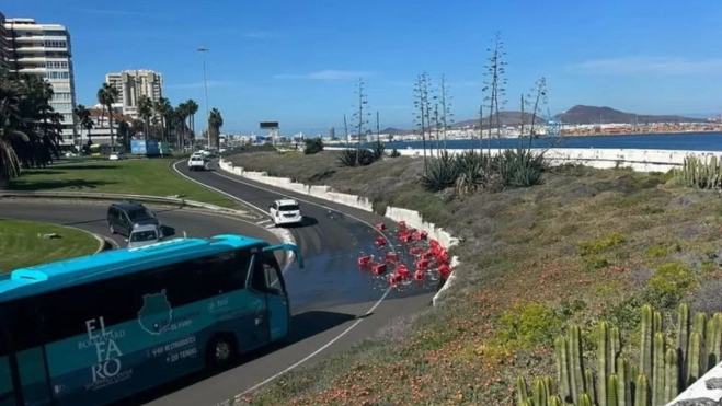 El suceso ha provocado que numerosas cajas rojas de la marca Firgas terminen volcadas sobre el asfalto, ocupando parcialmente el carril derecho de la curva. La presencia de estos objetos en la calzada ha generado una situación de riesgo para la circulación, especialmente para los vehículos pesados y las guaguas de transporte interurbano que transitan habitualmente por esta conexión clave de la ciudad.