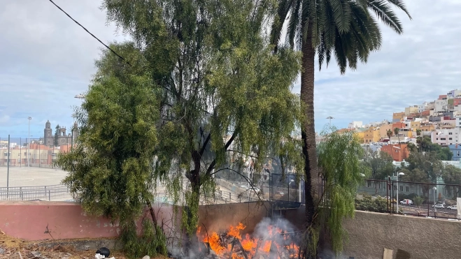El fuego, junto al Parque Infantil de San Nicolás y el Colegio Guiniguada, afecta a árboles y enseres de personas sin hogar, generando una gran columna de humo