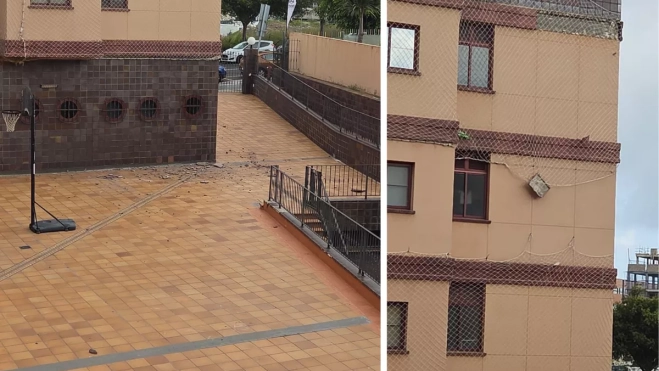 El incidente se produjo poco antes de las 16:30 horas, un momento clave de la jornada. Según relatan los testigos, los fragmentos de la fachada se desplomaron directamente sobre el patio interior, afectando a la zona de las canastas de baloncesto y la rampa en la que juegan los niños.