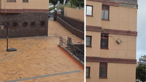 Los cascotes no han causado heridos porque cayeron poco antes de las 16.30 horas de este viernes, que es cuando suelen salir a jugar al patio los niños de este edifico de Siete Palmas, cuyos propietarios llegan años denunciando al Ayuntamiento y a Sanidad las ilegalidades de la clínica.
