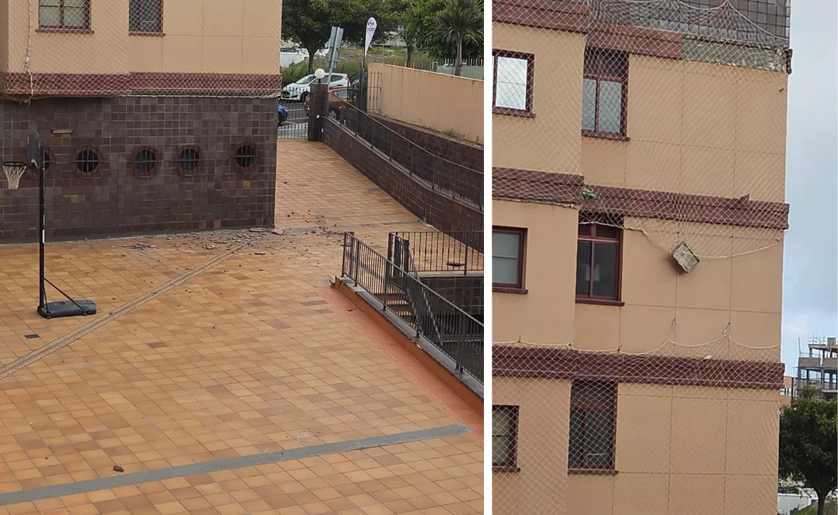 Los cascotes no han causado heridos porque cayeron poco antes de las 16.30 horas de este viernes, que es cuando suelen salir a jugar al patio los niños de este edifico de Siete Palmas, cuyos propietarios llegan años denunciando al Ayuntamiento y a Sanidad las ilegalidades de la clínica.