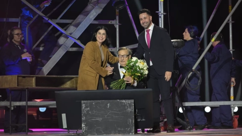 La alcaldesa, Carolina Darias, y el concejal de Carnaval, Héctor Alemán, arroparon al pregonero al finalizar su intervención y le hicieron entrega de un ramo de flores, en una imagen que simbolizó el cariño institucional y popular hacia una figura clave de las carnestolendas.