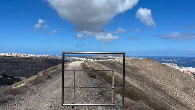 Pero lo que me llamó la atención el otro día fue ese panel de publicidad vacía por donde no pasan coches ni hay nadie que mire, solo los pocos que se adentran a correr, a caminar o a circular en bicicleta por esos senderos de tierra y polvo, de cal y piedra, de aulagas y de muchos pasos anónimos que nos fueron abriendo el camino. Pensé que podía haber quedado del rodaje de alguna película, o de una de esas carreras que conectan con El Fondillo y con el Guiniguada, para bajar luego desde el Jardín Canario hasta El Pambaso. Me paré un momento y traté de buscar lo que quedaba enmarcado en ese vacío del interior, lo que realmente enseñaba a quien pasaba delante. Estaba una nube hermosa y gigante encima de la ciudad, el puerto lejano, los barrios de las afueras y, siempre, por supuesto, el horizonte como referencia para quien vive en un espacio rodeado de agua por todas partes, ese horizonte como salida, nunca como entrada, como una utopía y como una hoja en blanco en la que cada cual debe inventar su manera de seguir viviendo. Desde tan lejos, o cuando volamos sobre ella o la vemos desde desde el Puerto, Las Palmas de Gran Canaria es una tirajala que trepa por algunas montañas en la que a veces nos parece mentira que quepa tanta gente. Y es sanador alejarte de vez en cuando para aprender a encuadrar lo que realmente vale la pena. En ese marco lejano no se percibe lo mal cuidada que está esa ciudad bella últimamente, pero sí que nos sirve para no perder de vista la nubes que dibujan esa belleza que pocas veces vemos cuando estamos debajo, tan ocupados y tan ciegos, que ni siquiera somos capaces de fijarnos en nuestras propias sombras. Busquen el marco y enfoquen siempre con la perspectiva que vayan inventando. Cada cual es su paisaje y su camino, su foto fija y su fotografía en movimiento. Lo que logres ver, será finalmente lo único que vivas y que recuerdes.