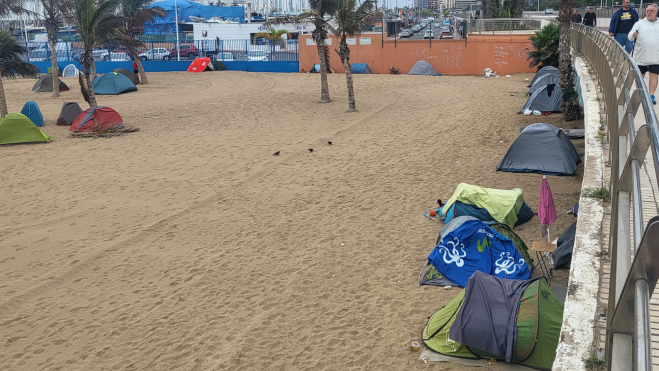 El campamento de la playa de Las Alcaravaneras sigue dando la bienvenida a mercantes, pesqueros, petroleros, cruceros de lujo y barcos de todo tipo que llegan a la bahía del puerto de Las Palmas de Gran Canaria. Hay mañanas en las que, en la parte sur de la playa, la tarjeta de visita de la capital, se pueden llegar a contar hasta 26 casetas de campaña. Allí duermen cada noche personas de diferentes edades y nacionalidades, algunas de paso y otras que aseguran que llevan viviendo en esa playa más de 20 años.