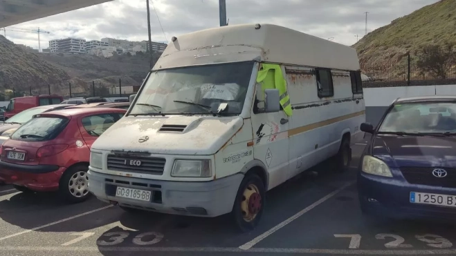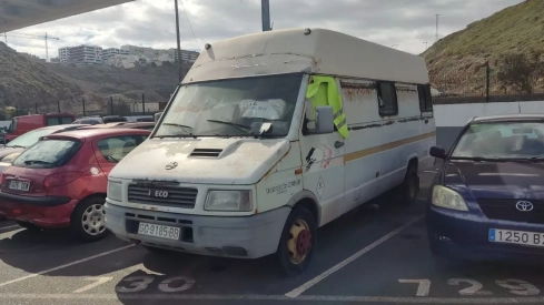 La situación del Iveco es la más sangrante: está oxidada y carcomida por años de salitre, cubierta de parasoles o trapos en los cristales para tener intimidad y tiene un pequeño panel solar en el capó, que le permite disponer de luz en su interior.
