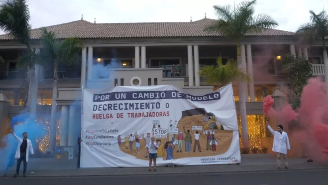 El movimiento ecologista Rebelión Científica irrumpe en Canarias. Quince activistas de ese colectivo y otras organizaciones se han manifestado frente al hotel Marylanza Suites & Spa en Arona, Tenerife, para denunciar "la insostenibilidad del modelo turístico en la región y la degradación de las condiciones de vida de la población canaria".