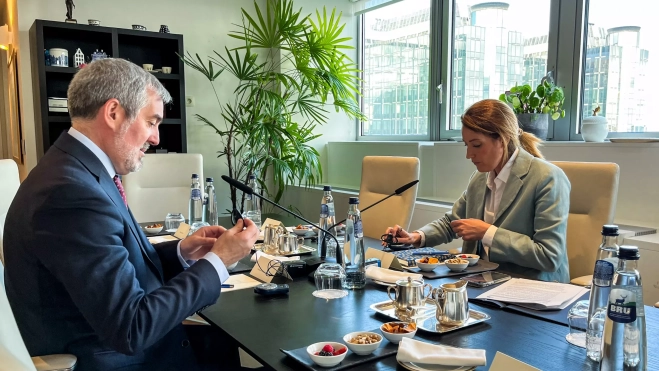 Durante su reunión en Bruselas con Metsola, el presidente del Gobierno canario ha subrayado la reafirmado la apuesta del archipiélago por avanzar hacia un modelo de desarrollo que mejore la distribución de riqueza y afronte el reto demográfico que afecta a 47 municipios.