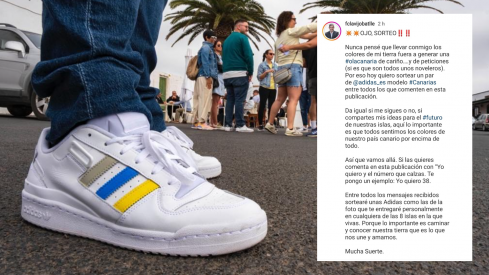 En Instagram es muy normal que los conocidos como influencers realicen sorteos de productos, pero no es tan normal que lo hagan políticos. Eso no ha echado para atrás al candidato de CC a la presidencia de las islas para realizar en su propia cuenta de Instagram el sorteo de unos tenis o playeras de la marca Adidas con los colores gris, azul y amarillo de Coalición Canaria. Hace unas semanas el candidato también subió una publicación donde mostraba este calzado deseando que la marca las distribuyera en el archipiélago.