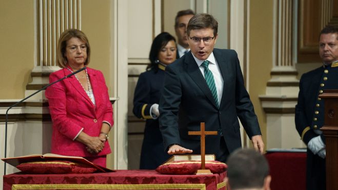 Nicasio Galván, portavoz de Vox en el Parlamento de Canarias, jura su cargo en la cámara autonómica. / RAMÓN DE LA ROCHA-EFE