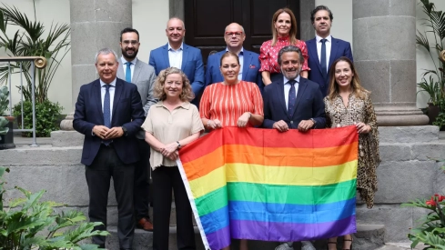La presidenta, junto a los miembros de la Mesa, Ana Oramas, Gustavo Matos y Patricia Hernández, acompañados por portavoces de los grupos parlamentarios, han mostrado su apoyo a los colectivos en este día con la bandera del arco iris como símbolo reivindicativo con el que la Cámara se suma a la lucha por la igualdad.
