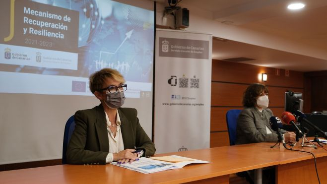 La consejera de Economía, Conocimiento y Empleo del Gobierno de Canarias, Elena Máñez, y la directora del Servicio Canario de Empleo, Dunnia Rodríguez, hicieron balance este lunes de la labor realizada por este organismo autónomo durante el año 2021.