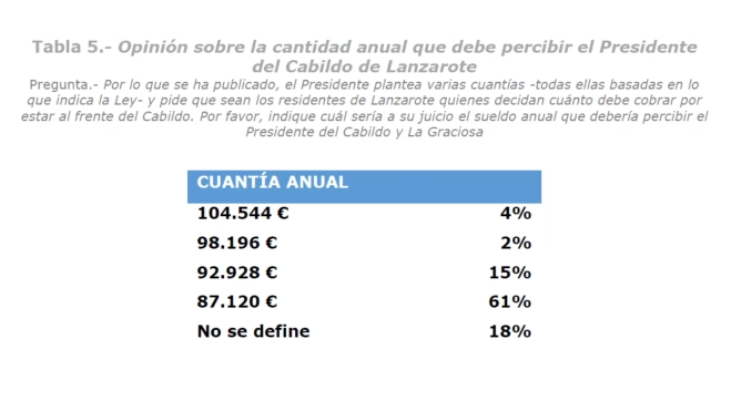 Según recoge el informe de la consulta sobre el sueldo del presidente insular, se realizaron 2.028 llamadas telefónicas; no obstante, se han considerado válidas tan solo 300 de ellas. El 61% de las personas, cuyas encuestas se estimaron correctas, eligió 87.120 euros como sueldo anual, frente a otras opciones más elevadas.