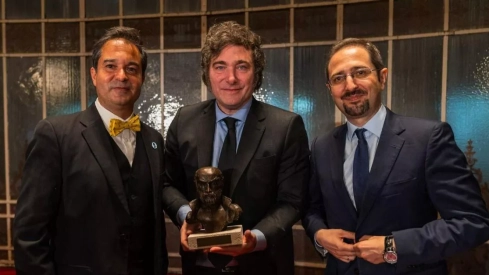De izquierda a derecha, Gabriel Álvarez, presidente de la Universidad de las Hespérides, Javier Milei, presidente de Argentina, y Manuel Llamas, director del Instituto Juan de Mariana./ ARCHIVO