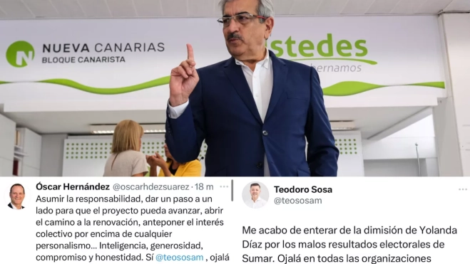 "Me acabo de enterar de la dimisión de Yolanda Díaz por los malos resultados electorales de Sumar. Ojalá en todas las organizaciones cundiera el mismo ejemplo", escribió Sosa en su cuenta personal de Twitter/X. Al mensaje del alcalde de Gáldar, que en las últimas elecciones locales lideró la candidatura del BNR bajo el paraguas de Nueva Canarias, le siguieron en la misma línea otras publicaciones de regidores de ayuntamientos grancanarios que en los comicios del año pasado utilizaron la misma fórmula de alianzas locales con el partido canarista.