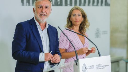 El presidente de Canarias, Ángel Víctor Torres, y la ministra de Transportes, Movilidad y Agenda Urbana, Raquel Sánchez, han firmado este lunes el protocolo de colaboración para aumentar del 30% al 50% la subvención al transporte terrestre por guagua y tranvía en las islas.