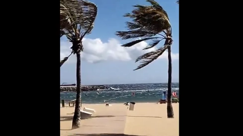 El servicio de Cruz Roja permanece pendiente de la situación, apunta el Cecopal, cuyo mensaje acompaña con un vídeo en el que se aprecian los efectos del viento en las palmeras y la zona de baño de la playa.