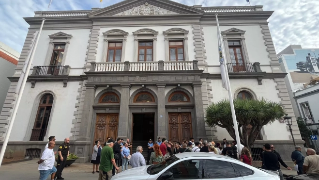 Cerca de medio centenar de comerciantes del Rastro de Santa Cruz de Tenerife se han movilizado este jueves en las puertas del Ayuntamiento de Santa Cruz -mientras se celebraba la Comisión de Control- para protestar por la decisión del cierre del rastro de forma inmediata, tras el informe firmado por Carlos Tarife el miércoles.