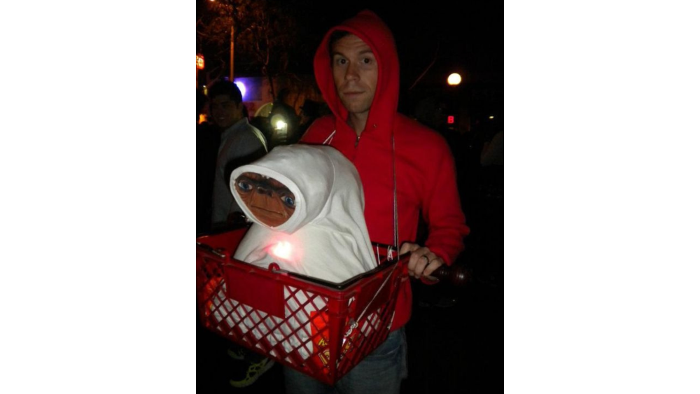 Es una vestimenta sencilla de recrear. Tan sólo hacen falta un suéter rojo con capucha, una caja de fruta para hacer las veces de cesta de la bicicleta, un peluche envuelto en una sábana blanca y una fotocopia de la cara de E.T. para pegarla sobre el peluche. También puedes pintarte la cara con tonos blancos para simular la palidez de Elliot en aquella escena de la película. Una pequeña luz roja debajo de la manta para recrear el dedo del extraterrestre es un remate perfecto para el disfraz.