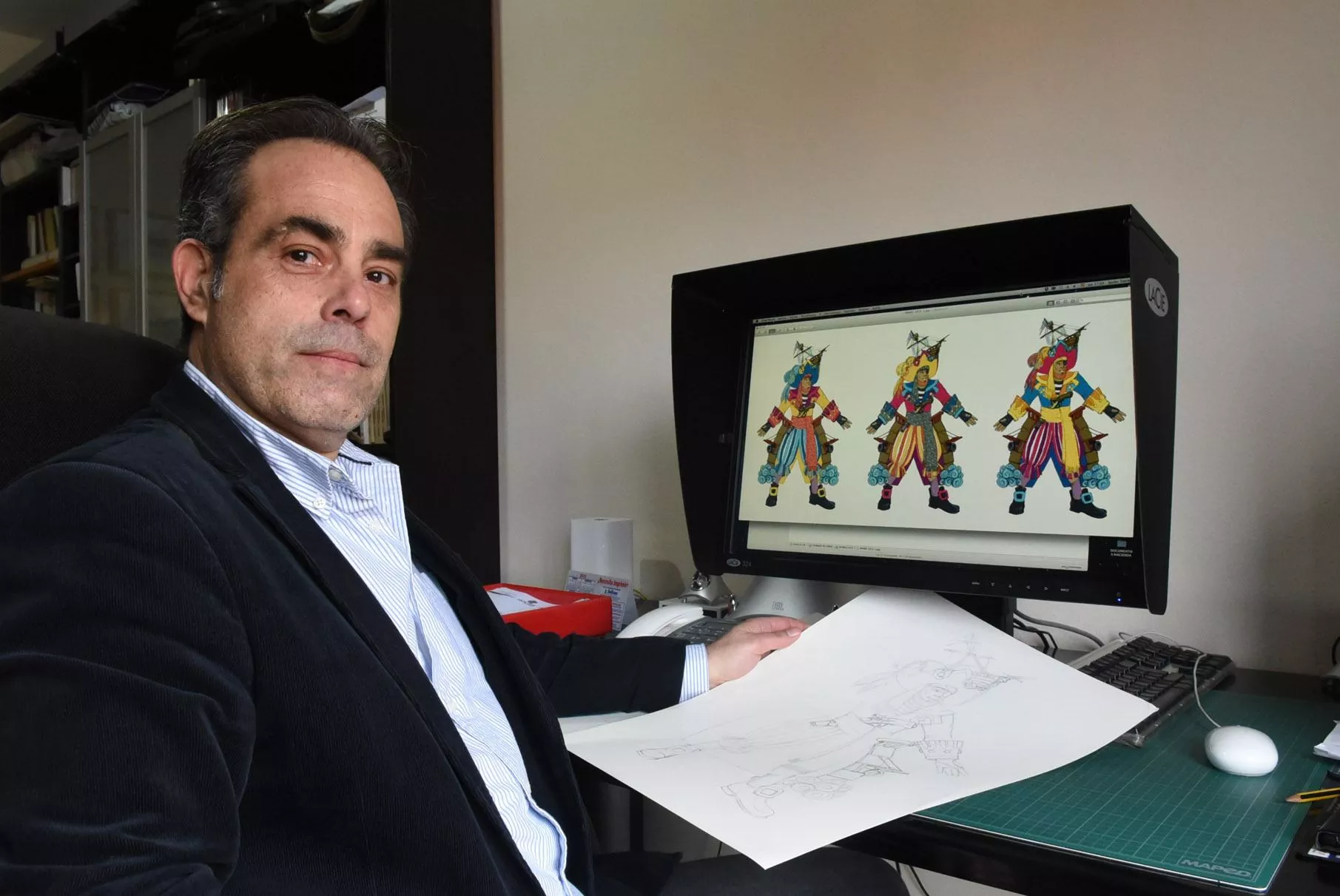 El trabajo más cómodo para mí, porque es un trabajo que queda más en casa y te expones menos (si me permites decirlo así) es el diseño de los disfraces, porque va más en tu zona de confort. Y a fin de cuentas es un espacio más reducido para resolver problemas. El cartel evidentemente, tiene una proyección hacia fuera, es juzgado a nivel general por la ciudadanía. El escenario es el elemento más complicado, evidentemente, al que al menos en el aspecto diseñístico, pero en mi caso fue tremendamente positiva y enriquecedora. Aprendí muchísimo de los excelentes profesionales con los que tuve la oportunidad de trabajar.