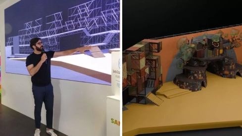 Precisamente, ese juego del andamiaje lo ha transformado el diseñador en una especie de cajas, como si fueran acantilados y casas de la civilización Dogón. “Es como que en una gran falla excavaron las casas y me pareció muy curioso. Es como una especie de Petra y también quise unificarlo con Canarias, como las casas cuevas de los antiguos aborígenes y la evolución que ha tenido la arquitectura canaria”, destaca.