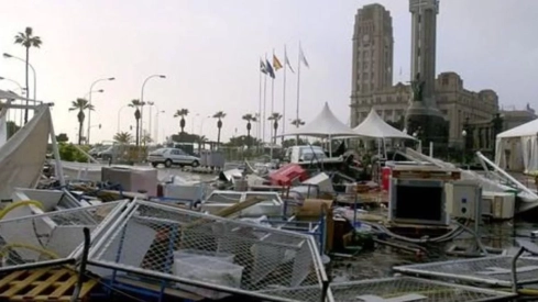 La imagen que presentaba la Plaza de España, Ramblas y Avenida de Anaga era desoladora. Restos de la carpa del Circo Chino que se había instalado en Guajara habían ido a parar al Puerto de Santa Cruz. Igual mala fortuna habían sufrido las terrazas del entorno de la Alameda: destrozadas por completo.
