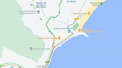 TRÁFICO: Retenciones de circulación en el acceso de vehículos a la playa de Las Teresitas, en el lugar @PoliciaLocalSC #PlayasSantaCruz