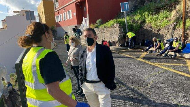 Durante el recorrido, el alcalde aprovechó la ocasión para visitar a la cuadrilla de trabajadores adscritos al convenio de Empleo Social que estos días se encuentran en Valleseco y, posteriormente, visitó las obras de la oficina provisional del distrito que se prevé abra sus puertas en el mes de marzo.