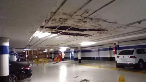 Lo que sí parece meridianamente claro es que no se averiguó en 2025 de donde venían esas humedades "que actúan como factor acelerador de los procesos de corrosión detectados" y que, ya en 2026, produjeron caídas de cascotes, el apuntalamiento de urgencia de parte del aparcamiento y cierre perimetral de la zona afectada.