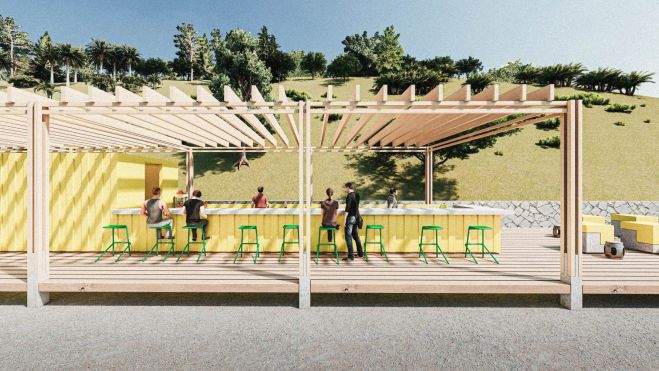 La plataforma donde se disponen los módulos de equipamientos estaría ligeramente elevada sobre el nivel del paseo potenciando las imponentes vistas existentes y estableciendo una separación por usos. Se dispondrán una serie de rampas de suave pendiente para garantizar la accesibilidad universal de la plataforma.