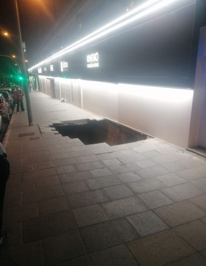 En la noche de este lunes se ha producido un suceso poco común en Santa Cruz. En la avenida Tres de Mayo, a la altura de un conocido centro comercial, se ha generado un inmenso socavón de "al menos tres o cuatro metros de altura", según un viandante que difundió su vídeo por las redes.
