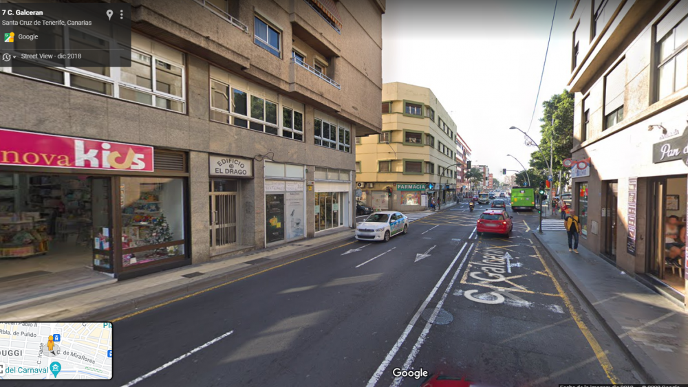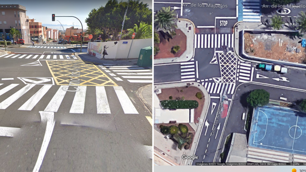 La cuadrícula está ahí porque la guagua necesita de ese espacio para poder girar, por lo que una detención sobre ella no solo será un suspenso directo sino que podría entorpecer notoriamente la circulación de Santa Cruz. Un problema añadido de este punto es que la línea de detención del semáforo está muy borrado por el desgaste del tiempo.