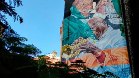 Justo a mitad de la céntrica calle del Castillo, en Santa Cruz de Tenerife, el sonido metálico de una trompeta se mezclaba con las conversaciones de los caminantes, el tropezar de las bolsas y el vuelo de las palomas. Era el sonido de una calle ajetreada y con vida, una calle acompañada por la trompeta del mítico músico dominicano Nilo Caparrosa, quien falleció el pasado marzo.Ahora ni las conversaciones, ni las bolsas, ni el vuelo de las palomas están acompañadas un fondo musical trompetero, sin embargo, justo a mitad de la céntrica calle del Catillo, la figura de Nilo Caparrosa se alza más grande que nunca: un mural de 16 metros de altura homenajea al músico justo allí donde tantas veces amenizó a los transeúntes.