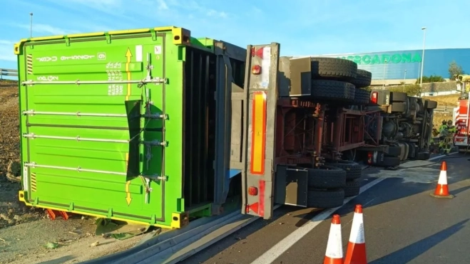 Un camión ha sufrido un vuelco lateral sobre las 7:30 de este lunes en la autopista TF-2, en sentido norte. El accidente ha ocurrido sobre el kilómetro 1, a la altura de la zona de Los Alisios, en Santa Cruz de Tenerife. No hubo daños personales graves, pero las colas se alargaron durante al menos siete horas.