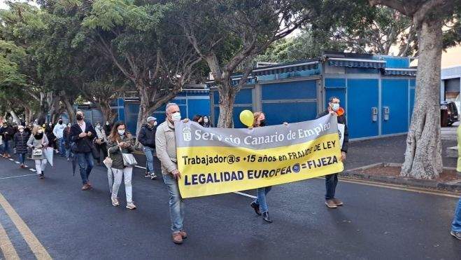 Más de 1.000 empleados públicos se han manifestado este jueves entre las dos capitales canarias en un conflicto que permanece abierto con el Gobierno de Canarias por el abuso de temporalidad al que tiene sometido a sus trabajadores, explica en un comunicado la plataforma PEFRALCA Canarias.Según indican, los empleados públicos se mojan. No lo hacen refiriéndose a las luuvias caídas este jueves en las islas que cayó durante la manifestación, sino también "en nuestros puestos de trabajo en los que hemos servido a la sociedad canaria desde hace más de 20 años, y lo hemos hecho en situación de precariedad", reivindican.Así, argumentan que ese esfuerzo, no solo no se premia por el Gobierno de Canarias, sino que "se castiga" abocándoles a unas "ofertas de empleo público en las que 27.000 familias podemos terminar en el paro".