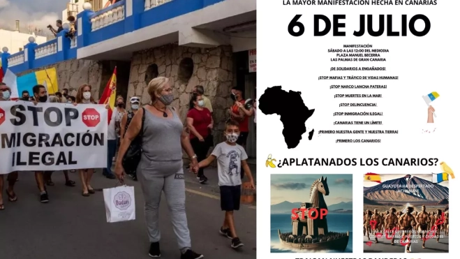 La convocatoria de la protesta circula por redes sociales con lemas que mezclan inmigración con criminalidad, como ¡Stop narco lanchas pateras! o ¡Stop delicuencia!, junto a otros como De solidarios a engañados o ¡Primero los canarios!.