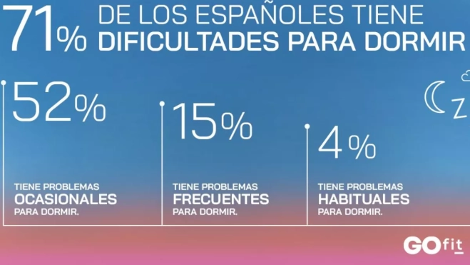 Un 71% de los usuarios encuestados por el Observatorio GO fit asegura tener algún tipo de dificultad para dormir, según los resultados de un estudio elaborado por la plataforma de investigación de GO fit, tras analizar las respuestas de más de 18.000 personas usuarias de sus centros deportivos en España.