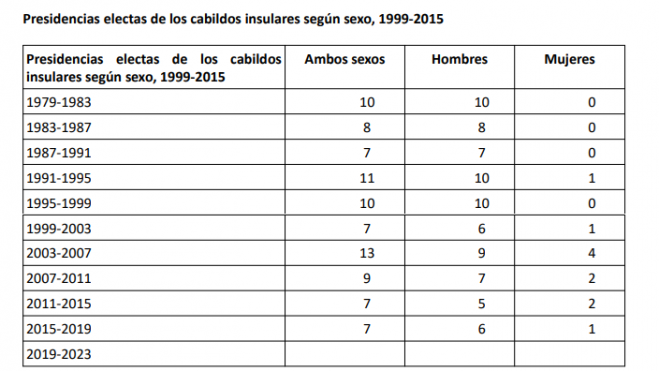 Estos cargos históricamente han estado ocupados por hombres en Canarias, sin embargo, si bien se observó un aumento de mujeres electas para la presidencia de los cabildos insulares entre 2003-2015, la tendencia recientemente ha vuelto a la baja, según la última encuesta de Hombres y Mujeres de Canarias (2019).