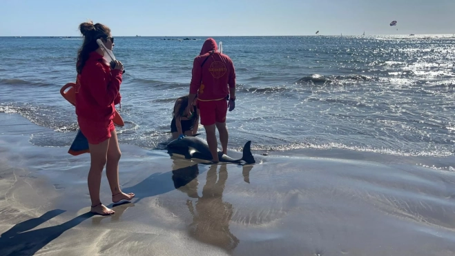 Aparece un delfín varado en la playa de Fañabé durante la tarde del sábado. El animal, que por su tamaño parece una cría, llegó a las costas de la playa tinerfeña donde una veterinaria que estaba disfrutando del sábado al sol, intentó atenderlo.