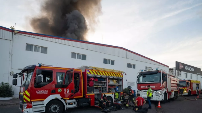 Para acceder con mayor rapidez, los bomberos han tenido que romper con una pala parte de una de las paredes de la nave y están realizando labores de enfriamiento en la zona.