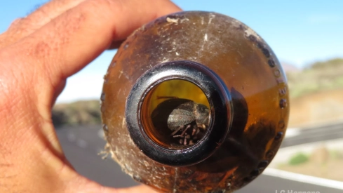José Carlos Herrero, educador ambiental y guía de montaña, ha mostrado esta realidad a través de sus redes sociales. En una imagen compartida por él, se puede apreciar a una Pimelia del Teide (Pimelia ascendens) atrapada en una botella aparentemente antigua.