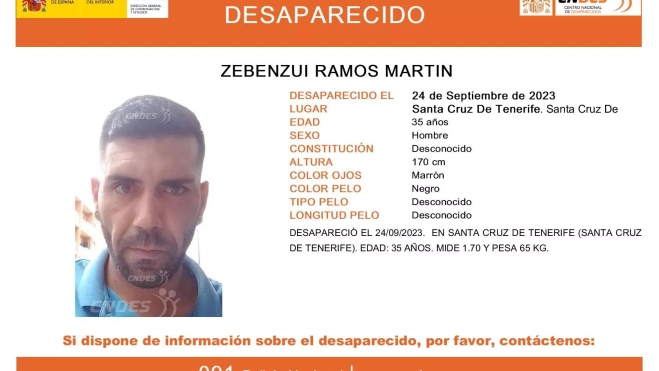 El Centro Nacional de Desaparecidos (CNDES) busca a Zebenzui Ramos Martín, un hombre de 35 años que desapareció el pasado 24 de septiembre en Santa Cruz de Tenerife.