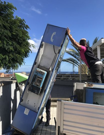 Les pedí permiso para sacar una foto mientras retiraban la cabina. No sé qué hice, pero les aseguro que, mientras escribía en word estas letras, una voz repetía la frase que iba terminando. Eso pasaba también en las llamadas de antes, que marcabas y se cruzaban de repente dos conversaciones desconocidas, o sonaba el teléfono de la propia cabina y era alguien que llamaba preguntando por un vecino. Me acuerdo de un amigo que estando una noche en el Puerto de Las Nieves, casi sin luz, se vio perseguido por una jauría de perros salvajes: se salvó porque se metió rápido en una de aquellas cabinas con puertas que hubo hace años. Muchos se refugiaron del frío en ellas, y también fue hogar para quienes no encontraban otro techo que el de esos espacios acristalados e iluminados en las madrugadas.