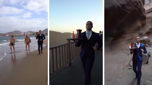 Al son de Nino Bravo y Julio Iglesias, este peculiar camarero recorre largas distancias y visita lugares únicos de las ciudades españolas. Se le ha visto delante de la Torre del Oro de Sevilla, subido en una lancha acuática, en una barbería, subido en helicóptero, en medio de un festival o incluso en Gran Canaria, y todo eso sin derramar ni una sola gota de la bandeja.